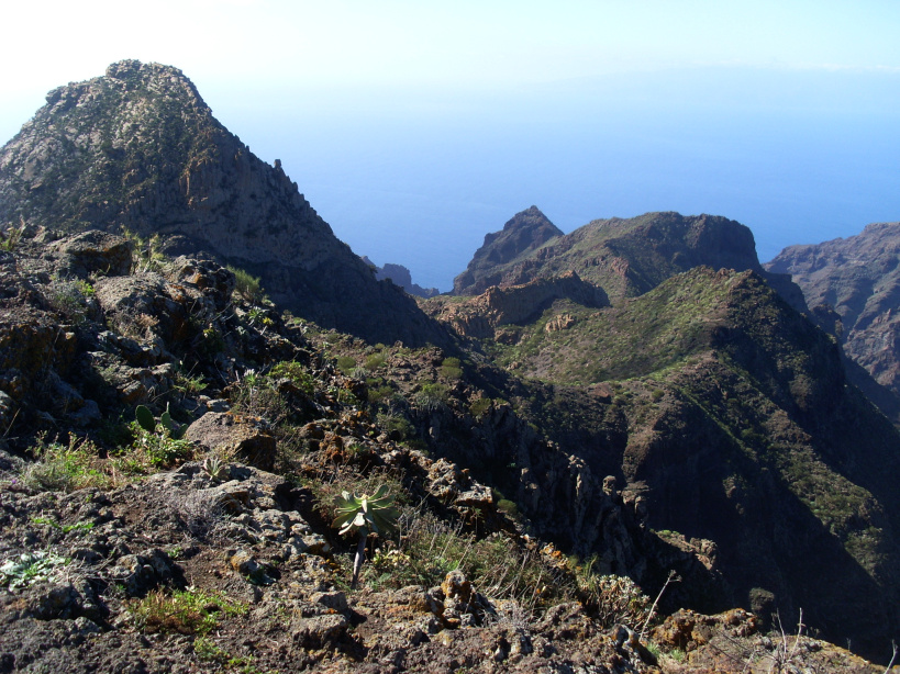 Herrliche, aussichtsreiche und wenig begangene Wege gibt es auf den schroffen Bergrücken zwischen Santiago del Teide und den Los Gigantes. In abgelegenen Fincas leben Ziegenbauern in stiller Einsamkeit. Der Blick geht weit ins Land und über das Meer, in der Ferne liegt La Gomera.