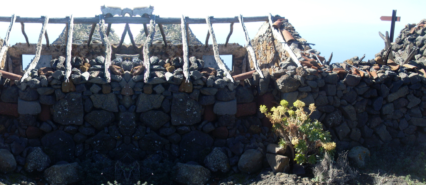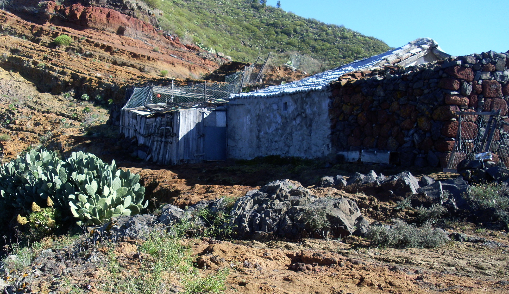 Auf dem Grat angelangt, hat man bereits einen Blick Richtung Meer und sieht deutlich den Verlauf des Wegs zum Ziegenfinca auf dem nächsten Berggrat. Es dauert nicht lange, dort hinüber zu gehen. Meistens wartet dort eine alte Frau, die Feigen und Käse verkaufen will. Vor den verfallenen Hütten hat man einen schönen Rastplatz mit herrlichen Ausblicken.