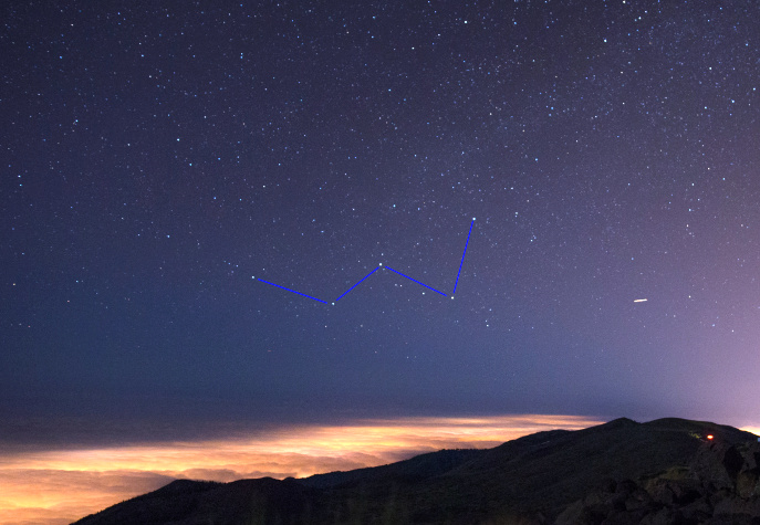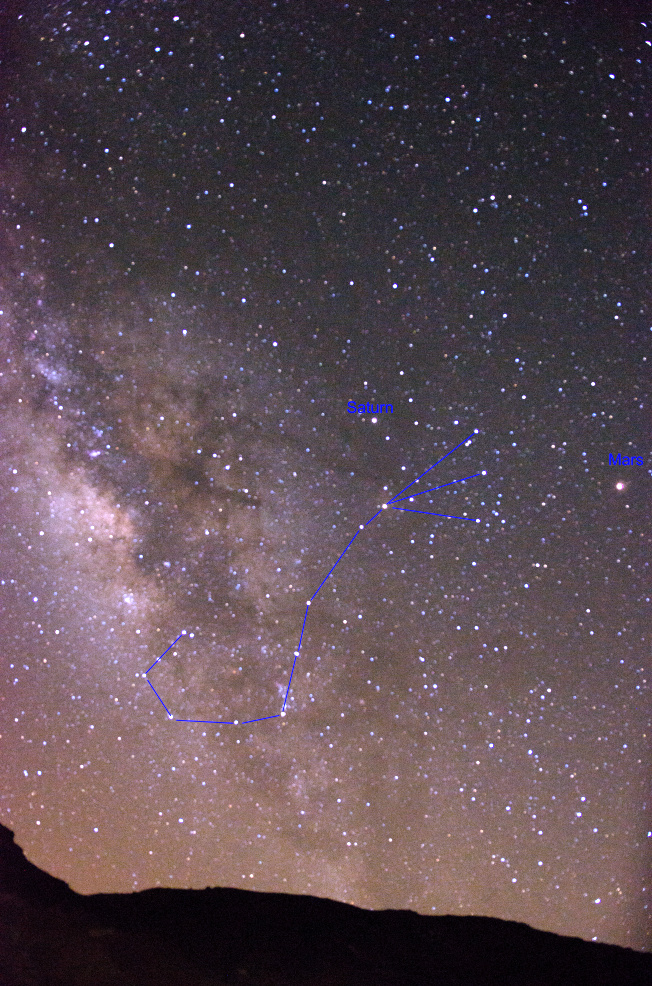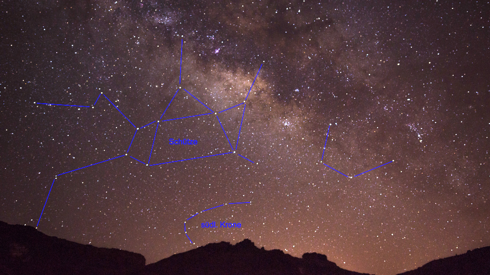 Am Standort 28°13’20“ N 16°37’21“ W, in 2000 m Höhe waren am 9.Juli 2016 um 23:13 Uhr am Himmel folgende Sternzeichen zu sehen: