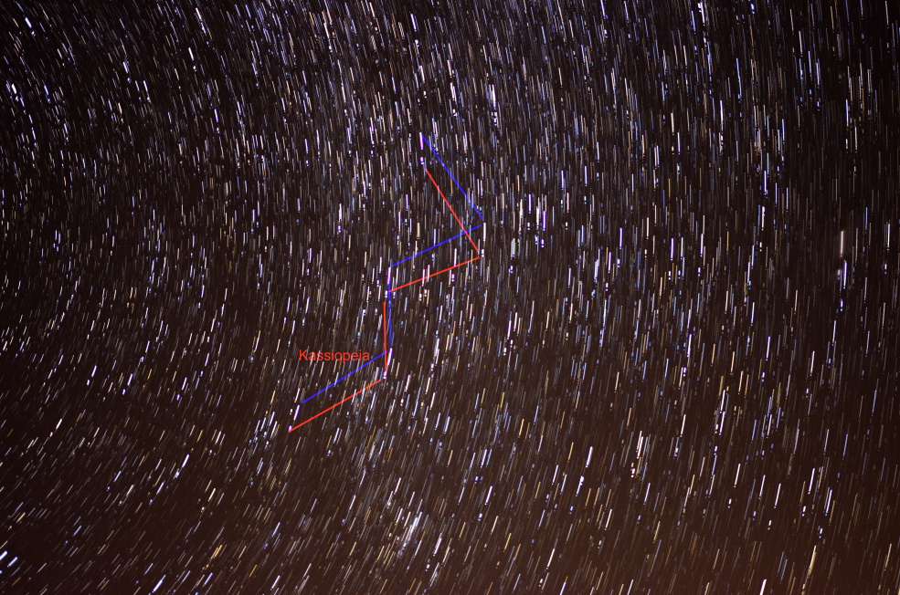 Was bisher nicht erklärt wurde, ist die Erstellung von Sternbildern aus der Vielzahl an Sternen, die auf einem Foto des Sternenhimmels sichtbar werden. Es gibt ein Programm, das für jedem Ort mit Ortskoordinaten, zu jeder Zeit und in jeder Himmelsrichtung den Sternenhimmel mit den Sternbildern darstellen kann. Eine Zeitmaschine also. Das mächtige Programm heißt „Stellarium“ und ist ebenfalls frei erhältlich. Man kann damit die Sternbilder zum Zeitpunkt der Aufnahme reproduzieren und so die dazugehörigen Sterne auf dem Foto finden und mit farbigen Strichen verbinden.