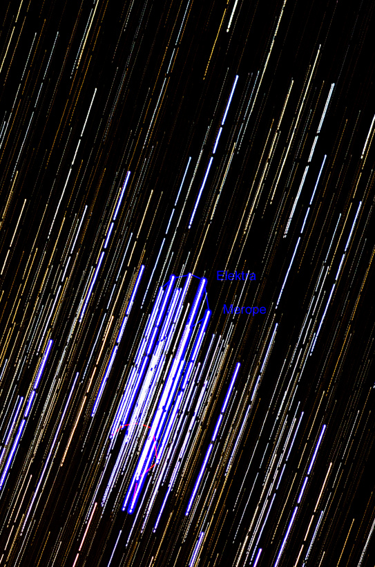 Bei der Erstellung von Sternentrails bleibt jede Momentaufnahme als Lichtpunkt an seinem veränderlichen Ort erhalten. Mit Hilfe von Software werden die Lichtpunkte je Stern übernommen und zu einer Trajektorie zusammengefügt. Je nach Lage der Himmelsrichtung erhält man unterschiedliche Sternenbahnen. Drehen die Sterne um den Nordpol ergeben sich kreisförmige Trajektorien. In Ostrichtung entstehen Geraden mit von unten nach oben gerichteten Trajektorien. Im Westen sind die Geraden von rechts oben nach links unten gerichtet. Zeichnet man in das erste und letzte Bild das Sternzeichen ein, dann bleiben diese Bilder sichtbar. Als Software wurde uns das frei erhältliche Programm „Startrails“ Version 2.3 empfohlen. Es verarbeitet alle Sternenbilder einer gleichen Serie zu Startrails.
