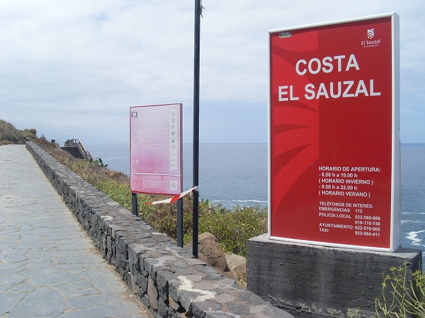 Etwa 200m nach der beschilderten Abzweigung nach Puntillo del Sol ist auf der linken Seite eine schmale Einfahrt, die aussieht wie die Zufahrt einer Finca. Dort steht ein rotes Schild „COSTA EL SAUZAL“. Die Schranke ist tagsüber offen, Öffnungszeiten im Sommer von 8 bis 22 Uhr, im Winter bis 19 Uhr.