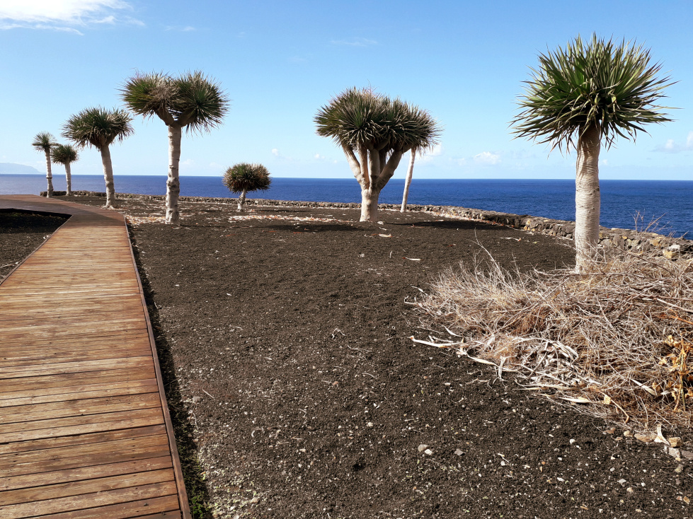 Man kann aber auch etwas weiter oben über Schotterwege durch die verlassenen Ackerterrassen laufen. Kurz hinter den steinernen Picknicktischen endet der Weg auf dem „Krokodil“, einer Felszunge, die etwas weiter ins Meer hinausragt. Dass diese aussieht wie ein Krokodil im Wasser, sieht man aber nur aus der Luft oder von den Aussichtspunkten weiter oben in El Sauzal.