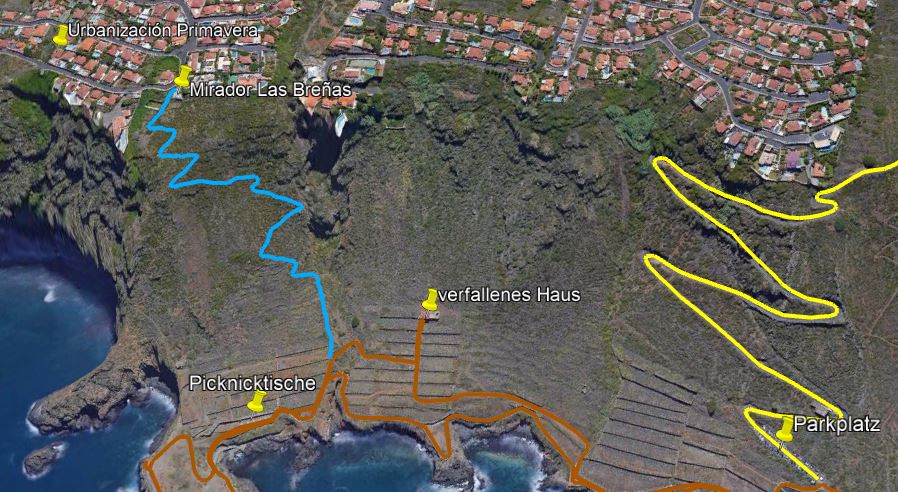 Wer es etwas sportlicher angehen will, kann auch auf einem sehr steilen Weg hinunter steigen. Er beginnt in der Urbanización Primavera direkt beim Mirador Las Breñas, wo das Denkmal für den Flugzeugabsturz von 1966 steht. Der Weg ist sehr steil und steinig und überwindet auf 750m Länge einen Höhenunterschied von 200m (den man auch wieder zurück muss!)