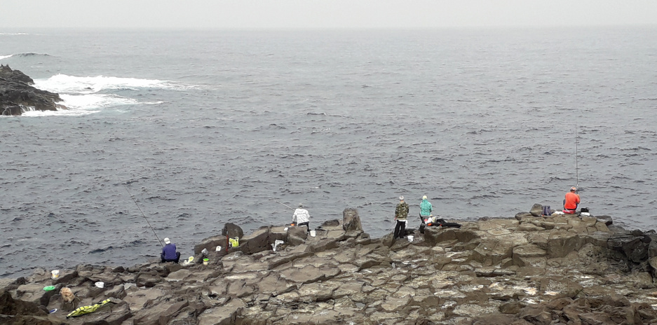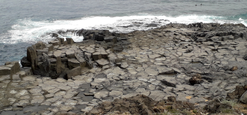 Danach geht man immer weiter auf der Schotterpiste an der Küste entlang. Sie führt von Bucht zu Bucht. Auf den Felsen sieht man Angler und am Wochenende auch Ausflügler, die sich einen versteckten Badeplatz zwischen den Felsen suchen. Bei Ebbe sieht man die regelmäßigen Basaltpflaster, die wie von Menschenhand gemacht aussehen.