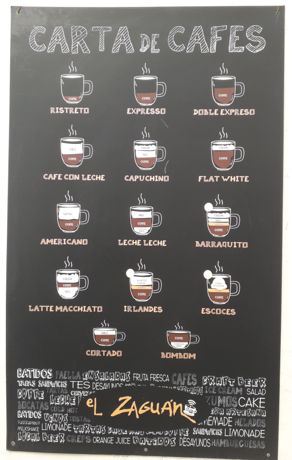 Wer einfach einen „café“ bestellt, erhält eine kleine Tasse schwarzen Kaffee – eine wirklich sehr kleine, aber nicht so stark wie der italienische Espresso. Wie überall in Spanien heißt er auch „café solo“.