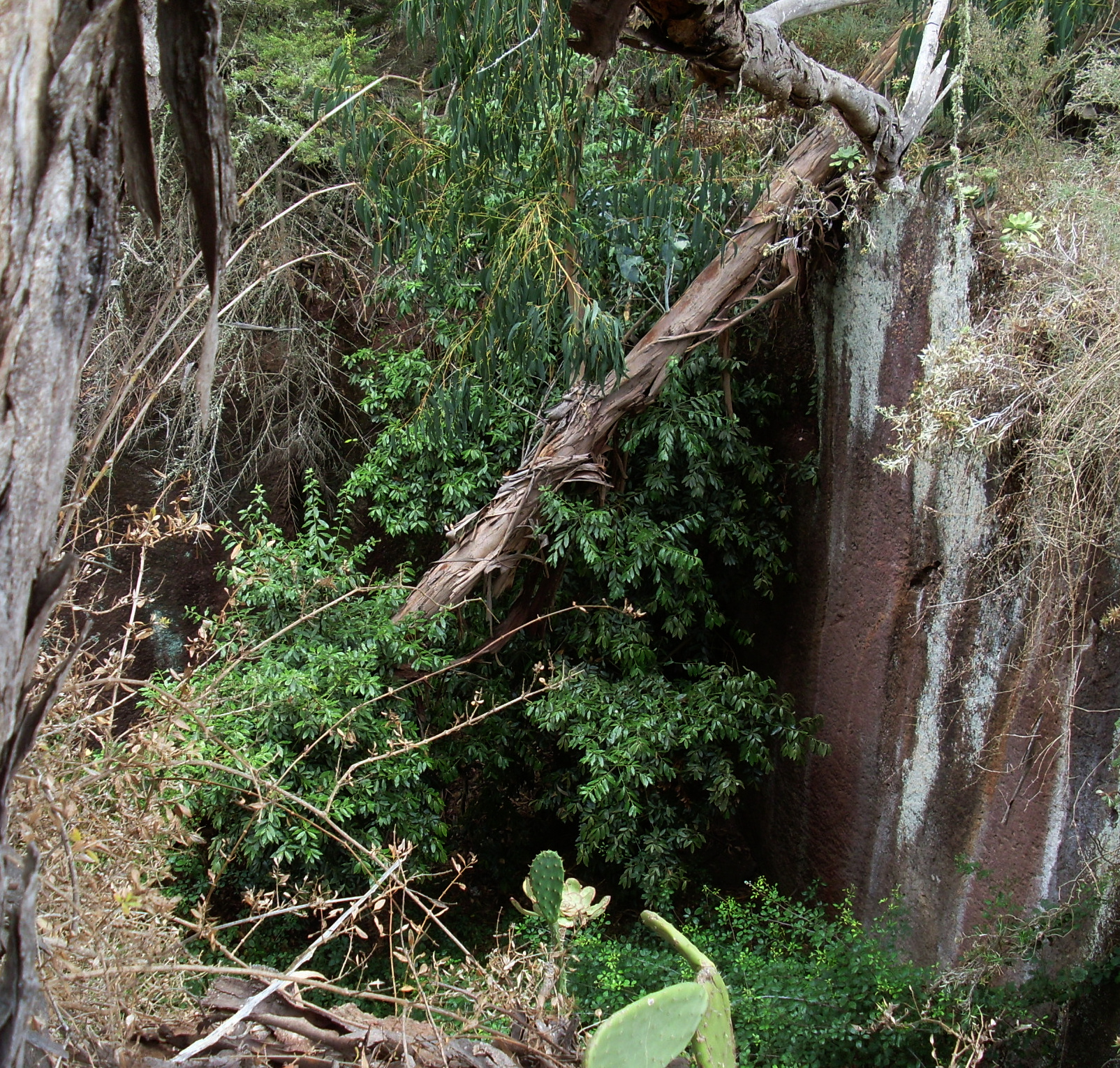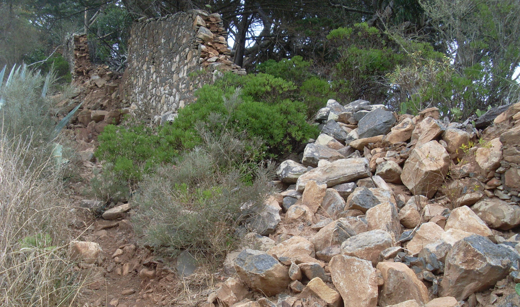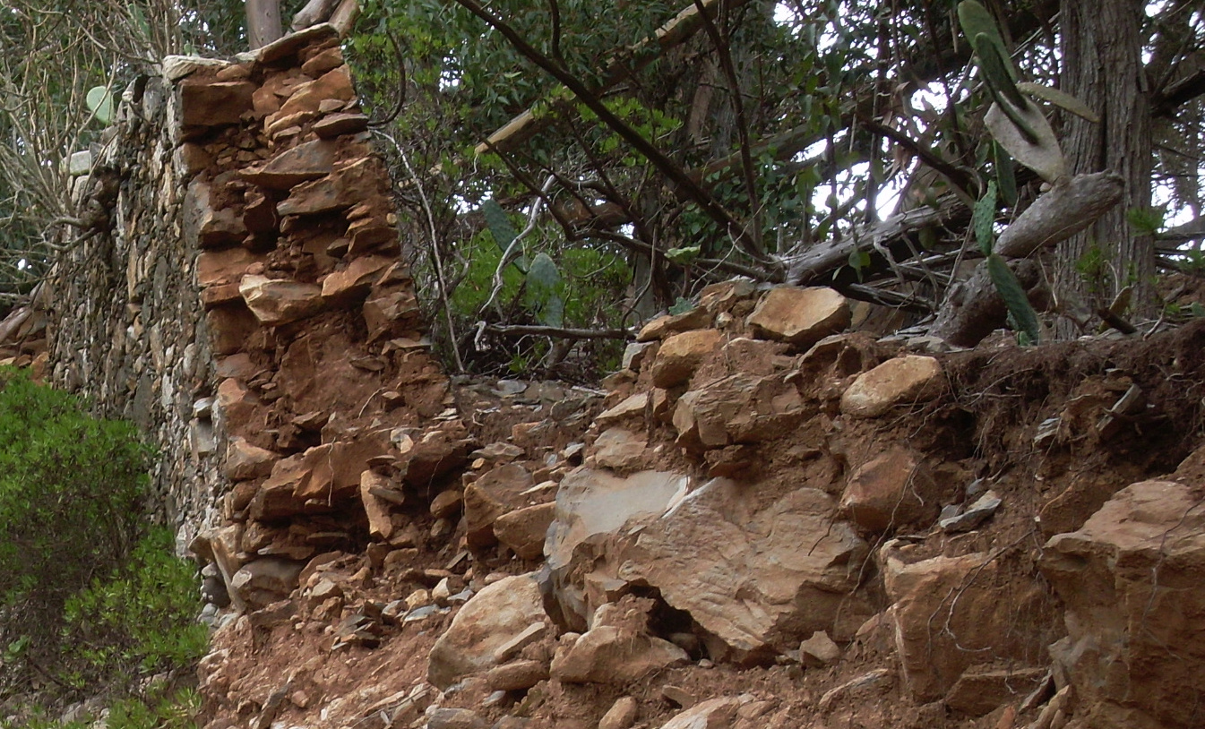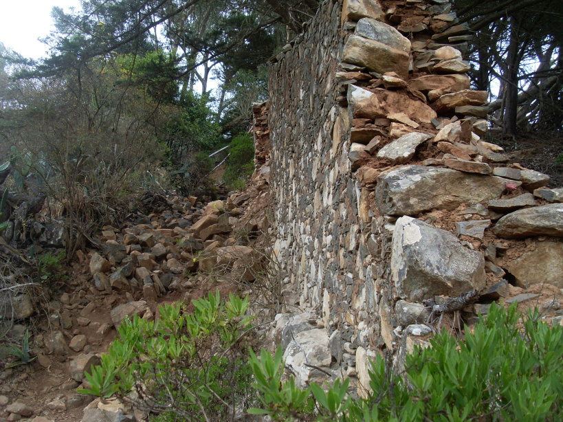 Zur Teufelsmauer findet man, wenn man direkt vor dem Eingangstor des Klosters einen Weg nach links geht, dieser knickt nach 50m rechts ab und führt nun geradeaus bergan, immer an der Klostermauer entlang. Dies ist noch nicht die Teufelsmauer. Der Weg ist stellenweise etwas zugewachsen, was für zunehmende Spannung sorgt. Weiter oben kommt man zwischen Eukalyptusbäumen und riesigen Opuntien hindurch. Dann knickt die Mauer abermals scharf nach rechts.