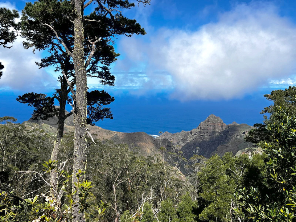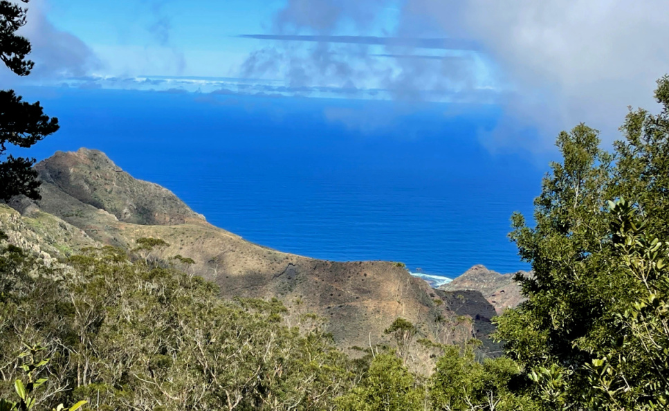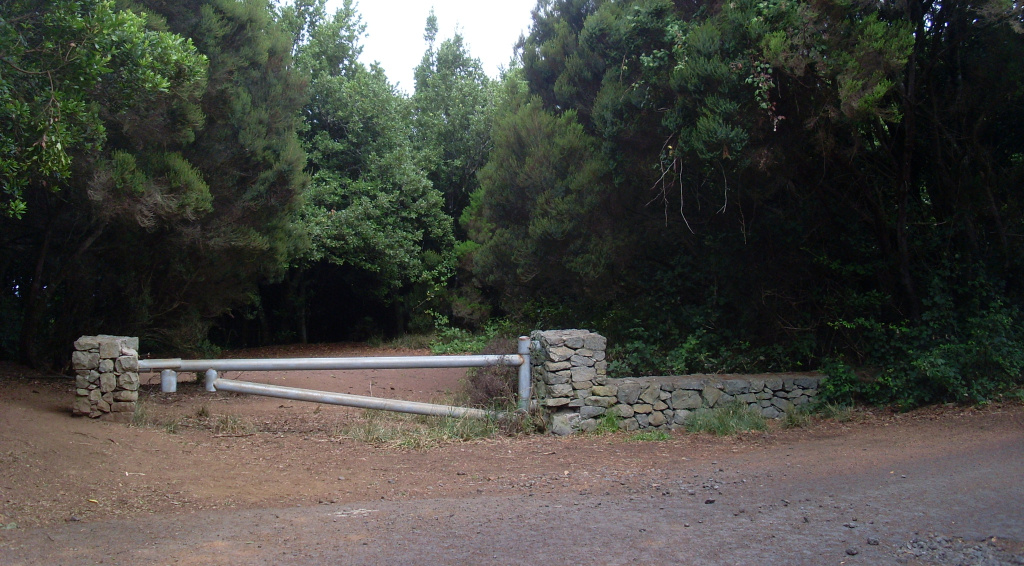 Hinter der Schranke geht man halb links auf den Weg, der leicht bergab führt schon nach 200m trifft man auf eine Forstpiste, der man nach rechts folgt. In etwa 10min lichtet sich der Blick, man hat eine Aussicht Richtung Meer. Hier stehen mehrere Baumruinen, die dem Tropensturm Delta im Jahr 2005 zum Opfer gefallen sind, einige Bäume wurden gefällt.