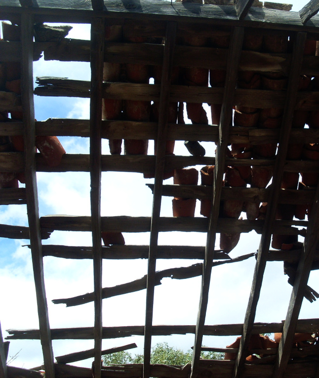 Es war ein großes Anwesen mit Innenhof und mehreren Gebäuden. Vom Dach sind nur noch ein paar Sparren und wenige Ziegel erhalten