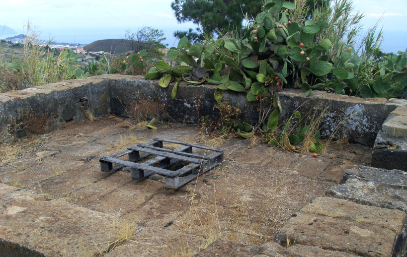 Alles ist mit riesigen Opuntienkakteen überwuchert. Vor dem Haus erkennt man noch die gepflasterte Dreschfläche und zwischen den Steinbrocken entdeckt man noch einen Teil der Küche mit zwei Öfen. Oberhalb des Hauses findet man einen Brunnen, der Brunnenaufsatz wurde gerettet und steht im historischen Museum von La Laguna.
