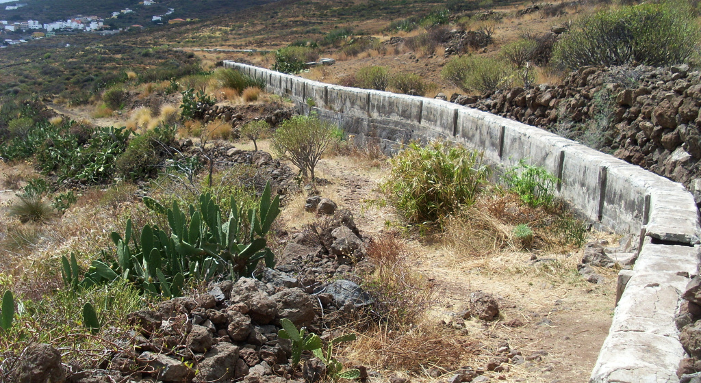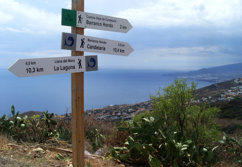 Oberhalb der Kirche folgt man zunächst kurz dem ausgeschilderten Weg zum Lomo Centeno, der aber gleich bei einem Strommast scharf nach links und steil nach oben abbiegt. Nicht diesem Weg folgen! Direkt hier könnte man auf einem steinigen Pfad in den Barranco hinabsteigen und auf der anderen Seite wieder hoch. Es ist aber bequemer, auf der Asphaltstraße zu bleiben (Calle Las Camelleras), die in einer Kurve ebenfalls auf die andere Seite des Barrancos führt. Hier beginnt das Municipio von El Rosario. Dort sieht man die Beschilderung für den Weg SL-TF 301. Es ist ein Rundweg. Man geht auf dem steilen Sträßchen ein Stück aufwärts. Kurz bevor der Asphalt endet, verteidigen kläffende Köter ihr Reich. Danach kommt man zu einem grünen Gebäude hoch, und Weg wird steinig. Er ist mit weißen Farbflecken gut gekennzeichnet. Gemächlich steigt man in gleich bleibender Richtung durch den Hang bergan, nur einmal macht der Weg eine S-Kurve durch ein Tälchen.