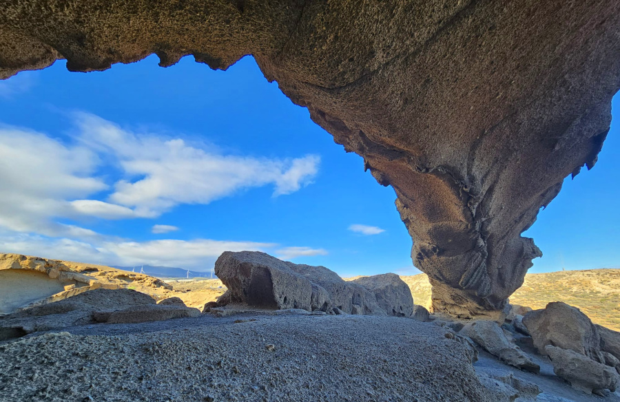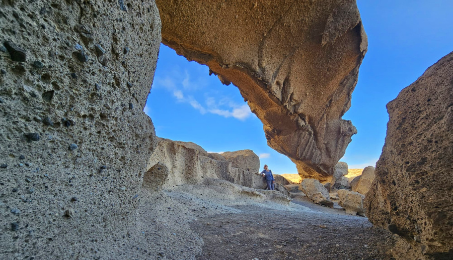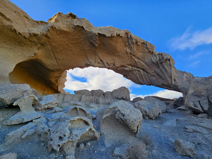 Dieser natürliche Felsbogen liegt versteckt in der Trockenlandschaft im Südosten Teneriffas, nicht weit ab von der Autobahn, und trotzdem ziemlich unbekannt. Ein Schatz der Vulkanlandschaft.