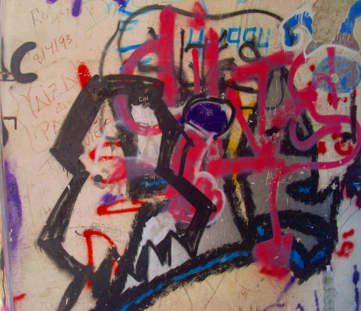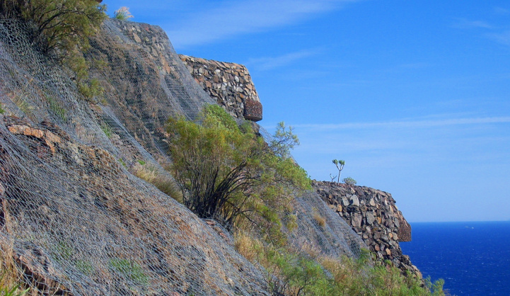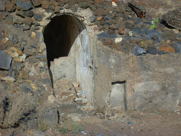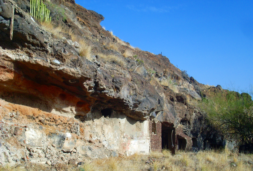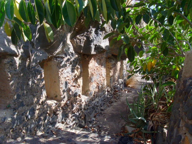 Zuerst geht man nach links oben, wo direkt unter der Stützmauer der Autobahn in einem Barranco mehrere Ruinen und „Höhlenwohnungen“ zu finden sind. Man erkennt noch die gekachelten Räume, die vermutlich Küche oder Baderäume waren. Ein schmaler Tunnel mit Fensteröffnungen führt unter dem überhängenden Felsen entlang. Die betonierte Treppe ist mit Bäumen und Bougainvillea überwuchert.