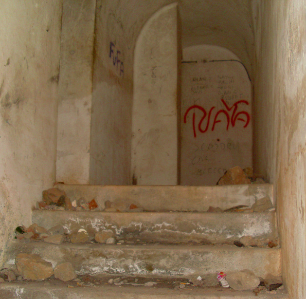 Aber man kann in den Tunnel hineingehen, wenn man eine Taschenlampe dabei hat, denn es ist dort stockfinster. Der Schacht geht zuerst senkrecht in den Berg hinein und biegt dann rechtwinklig ab. Dort drinnen sind einige winzige Zimmerchen mit „Fenstern“, in die nie das Tageslicht dringt. Dort mussten die Soldaten hausen. Am Ende des Tunnels gehen einige Treppen nach oben und unten in die eigentlichen „Bunker“.