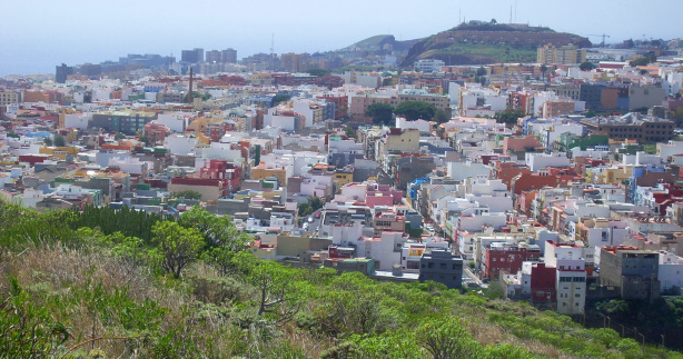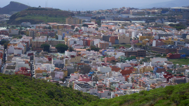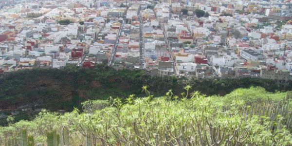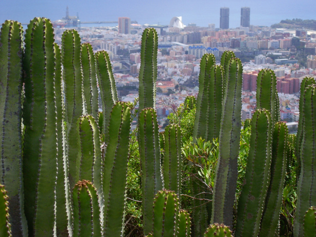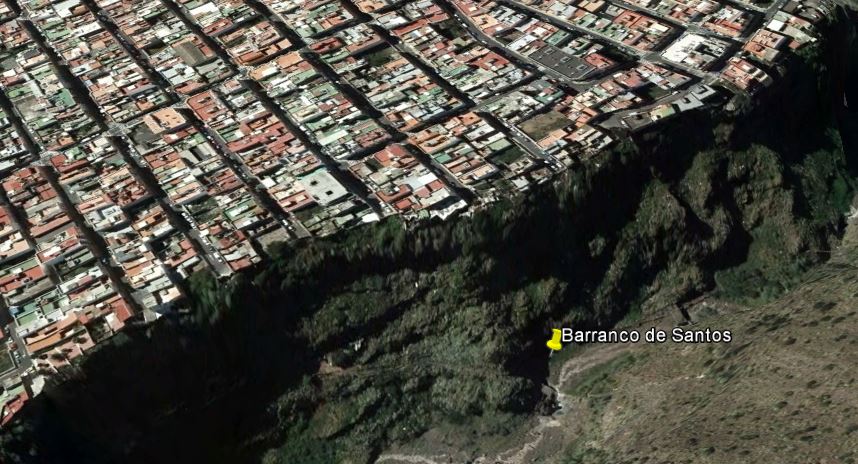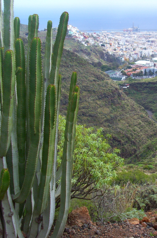 Oben angekommen geht man geradeaus weiter auf die großen Kandelaberkakteen zu. Von dort sieht man auf der einen Seite nach Santa Cruz, auf der anderen nach La Laguna. Der zunächst noch gut sichtbare Weg senkt sich langsam etwas ab und verliert sich dann im Gebüsch. Bevor es zu steil und gefährlich wird, sollte man umkehren. Tief unten verläuft der Barranco de Santos, darüber der dicht besiedelte Stadtteil La Cuesta von La Laguna, dessen Straßen am Barranco enden.