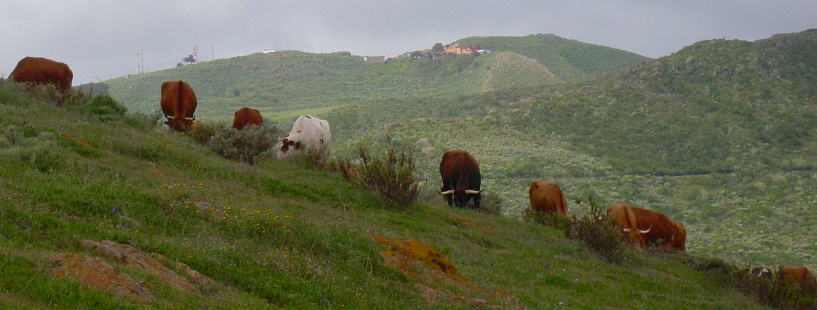 Für den Rückweg nimmt man jetzt den Weg, der nach links schwingend an der gegenüberliegenden Bergkuppe entlang führt und langsam an Höhe verliert. Hier könnte es sein, dass man großen Tieren begegnet, die sonst auf Teneriffa eher selten anzutreffen sind. Sie sind auch der Grund für den elektrischen Weidezaun.