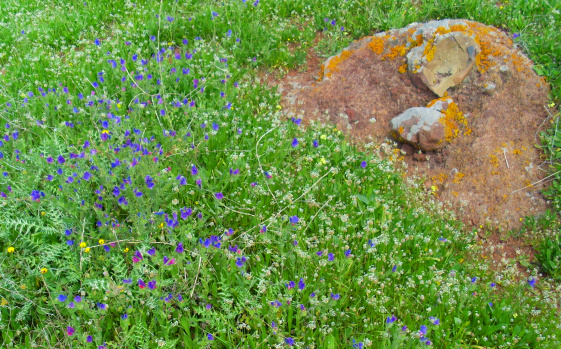 Auf diesem flachen Bergrücken wurden früher auch Weizen, Gerste und Kichererbsen angebaut, weshalb die natürliche Vegetation von Tabaibas und Cardonales hier verschwunden ist. Man hat eher den Eindruck, auf einer Almwiese zu sein, die im Frühjahr mit vielen Blüten eine herrliche Bienenweide ist.