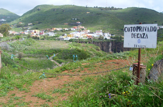 Jetzt folgt man aber nicht dem abwärts führenden Weg. Dieser würde nach einigen Serpentinen ziemlich weit unten, in 250m Höhe direkt über dem Barranco de Santos enden. Stattdessen geht man scharf nach rechts und fast parallel zurück, ebenfalls ein recht ebener Weg. Rebhühner flüchten schnatternd und flatternd durchs Gebüsch, Kaninchen hoppeln über den Weg und Falken ziehe ihre Kreise in der Luft. Direkt nachdem man unter der Stromleitung durchgegangen ist, etwa 100m vor dem roten Haus, entdeckt man spitzwinklig nach links abzweigend einen ansteigenden Pfad. Dieser führt etwas steiler hinauf auf den Höhenrücken der Montaña de Guerra.