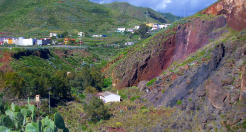 Der Abstiegsweg mit weiteren schönen Ausblicken führt um die Bergkuppe herum und in mehreren Haarnadelkurven hinunter zu den Häuser von Valle Tabares. Wenn man bei der letzten Serpentine nach links geht, befindet man sich direkt oberhalb des Lochs, das die Explosion des Munitionsdepots gerissen hat. Die letzten 150m auf dem Camino Montaña Guerra führen zurück zur Hauptstraße.