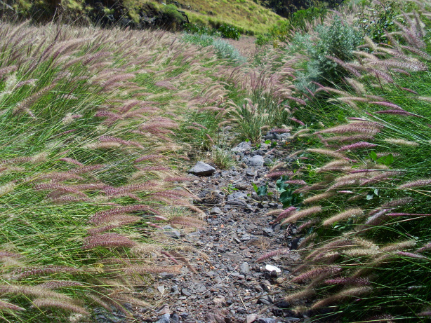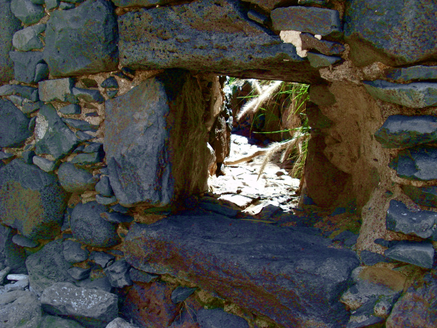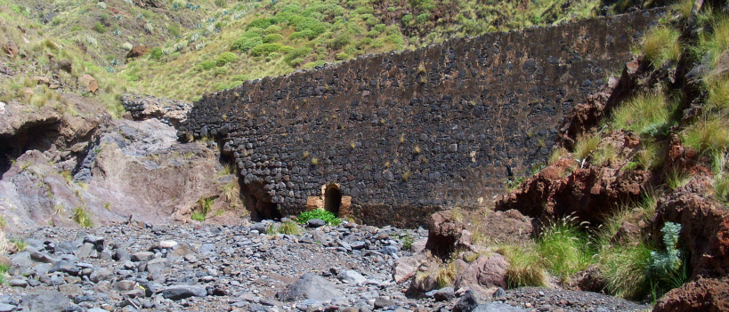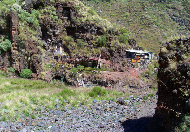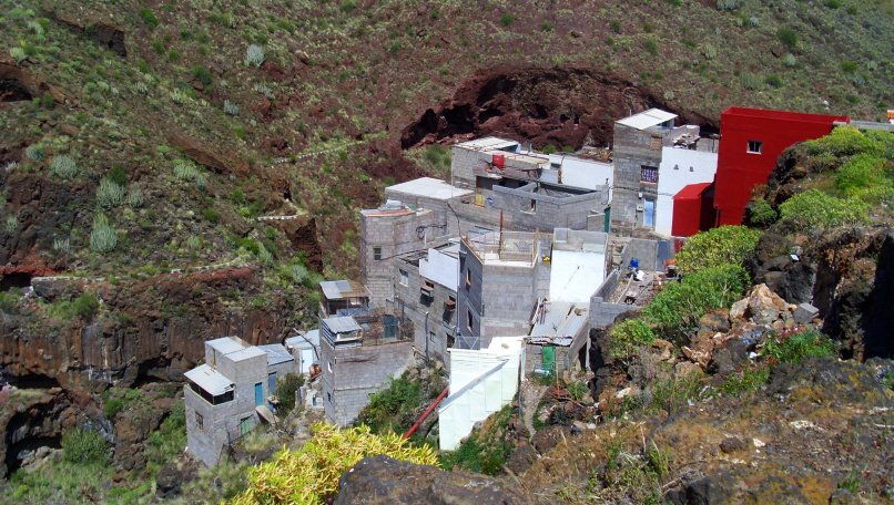 Am südlichen Rand der Schlucht sieht man viele einfache Hütten, die an den Stellen in die senkrechte Felswand gebaut wurden, wo es natürliche Höhlen gab. Meist wird dort Kleinvieh gehalten. Interessant ist eine Häusergruppe, die auf einen schmalen Felsvorsprung gebaut ist. Hier gibt es auch eine Möglichkeit, auf einem abenteuerlichen Trampelpfad in den Talgrund hinabzusteigen, von dort könnte man im Flussbett weitergehen bis zur Ermita de la Candelaria (s. unten). Ein Stück weiter schwenkt das Tal nach Südosten und hat jetzt einen 30-50m breiten Talgrund. Am flachen Südhang sieht man einige verlassene Ackerflächen. Das Katzenschwanzgras hat sich auf den fast das ganze Jahr über trockenen Schotterflächen stark verbreitet.