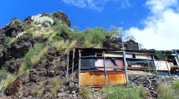 Hoch über der Schlucht sieht man nun nach einem längeren unbebauten Abschnitt zum ersten Mal wieder Häuser. Sie gehören zum Stadtteil Cueva Roja, der bereits zu Santa Cruz gehört. Ein Aufstieg ist von hier aus aber nicht möglich. Von oben hat man einen herrlichen Blick über diesen wildesten Teil des Barranco de Santos. Cueva Roja ist der Endpunkt einer anderen Wanderung, die hier beschrieben ist: Der Milchmädchenweg.