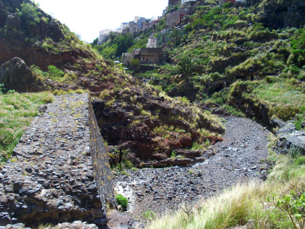 Etwa 400m unterhalb der Cruz de Marca verengt sich das Tal beträchtlich und es ist nicht mehr so tief. Die Bebauung reicht nun auf beiden Seiten bis direkt an den Talrand. An dieser Stelle gibt es eine kleine, einspurig befahrbare Brücke. Weiter abwärts gibt es im Bachlauf viele Wasser- und Abwasserleitungen, an vielen Stellen läuft Abwasser auch direkt ins Bachbett. Zusammen mit dem überall herumliegenden Müll ergibt sich ein hässlicher, stinkender Einschnitt in der Landschaft. Hinter Staumauern oder in Tümpeln verdunstet die trübe Brühe, verbunden mit den dazu gehörenden Gerüchen.