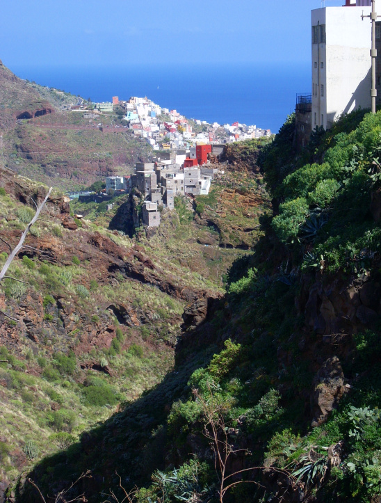 Direkt unterhalb des Wasserfalls mündet von links die Seitenschlucht ein, die aus dem Tal von Tabares kommt. Von hier an ist die Schlucht sehr schmal und tief und die beiden Seiten unterscheiden sich landschaftlich sehr. Auf der linken Seite erhebt sich die Montaña der Guerra (Über den Dächern der Stadt). Die Abhänge sind steil und grün, es gibt einige Abbrüche. Häuser gibt es jetzt keine mehr auf der linken Seite. Rechts dagegen steigt eine senkrechte Felswand aus dem Talgrund, an deren Kante die letzten Häuser des Stadtteil La Cuesta stehen. Dieser Stadtteil liegt auf einer leicht geneigten, aber relativ ebenen Fläche. Alle Straßen führen senkrecht auf den Abbruch zu und enden dort.