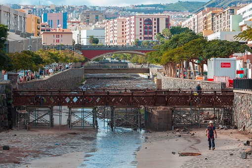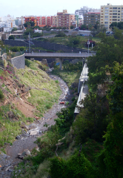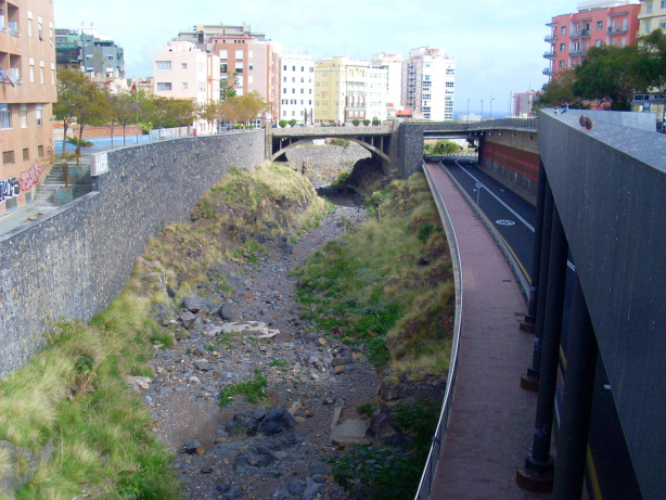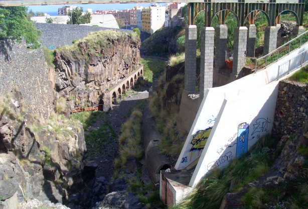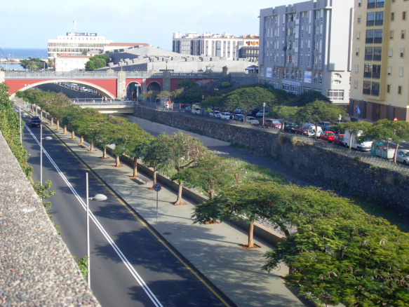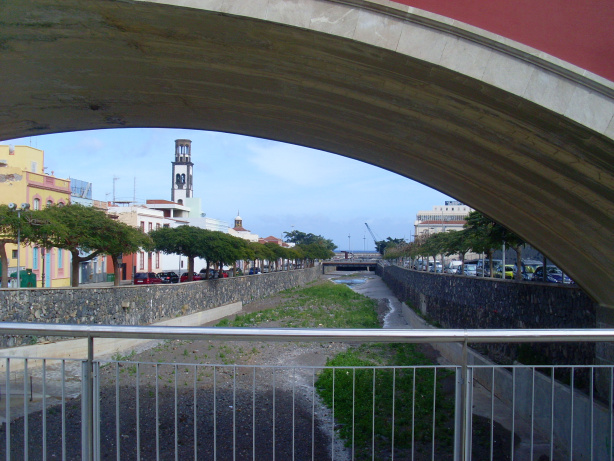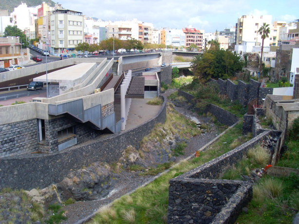 Nur 50m weiter unterquert der Fluss die Avenida Marítima und mündet in den Hafen von Santa Cruz. Dass es sich wirklich um einen Fluss handelt, ist vielen Menschen nicht klar. Denn er ist meistens ausgetrocknet. Erst wenn sich an wenigen Tagen im Jahr reißende Wassermassen ihren Weg zum Meer bahnen, wird deutlich, wie wichtig die wasserbautechnischen Maßnahmen sind. Der Barranco de Santos zerschneidet die Hauptstadt als hässlicher Riss, und schon oft wurde überlegt, wie dieser Raum städtebaulich zu nutzen wäre. Es gibt Pläne für Parks und Freizeitanlagen, aber die zentrale Frage ist, wie man sich vor dem gefährlichen Wasser schützen könnte.