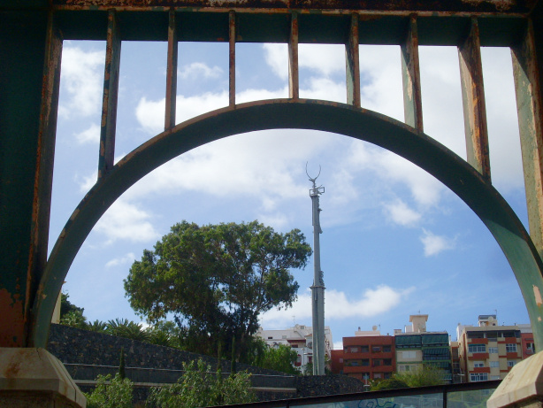 Gleich 150m weiter, auf Höhe der Kirche Nuestra Señora de la Concepción, überquert ein Fußgängersteg den Fluss. Dies ist die El Cabo Brücke, und die älteste über den Barranco de Santos, mit wichtiger historischer Bedeutung. El Cabo ist der Name des Stadtbezirks unmittelbar südlich dieser Brücke. Hier gab es vermutlich schon im Jahr 1500 einen einfachen Steg, und nur hier konnte man über den Fluss kommen, was bei starker Wasserführung nicht ungefährlich war. Es waren nur ein paar Holzplanken für Fußgänger oder Reiter, schwere Transporte oder Wagen mussten sich weiterhin durch die Furt quälen. 260 Jahre lang, bis zum Bau der Zurita Brücke, war der Pfad über diese Brücke die einzige Möglichkeit, von Santa Cruz aus ins Inselinnere zu kommen. Immer wieder im Laufe der Jahrhunderte wurde dieser Steg durch Wassermassen zerstört und weggespült. Nach einer Überschwemmung im Jahr 1722 beschloss man, die Puente Zurita zu bauen. Das schlimmste Unwetter der Insel von 1826 zerstörte die El Cabo Brücke erneut. (Hier findest du einen Artikel über diese Katastrophe: Der Tag, an dem die Jungfrau verschwand.) 1837, 1855, 1879 waren Jahre, in denen die Brücke ebenfalls komplett zerstört wurde. Erst 1892 wurde eine Stahlbrücke in der damals übliche Bautechnik errichtet, die eine sichere Überquerung möglich machte, sie hatte einen zentralen Steinpfeiler. Die Pflastersteine wurden später mit Asfalt überdeckt.