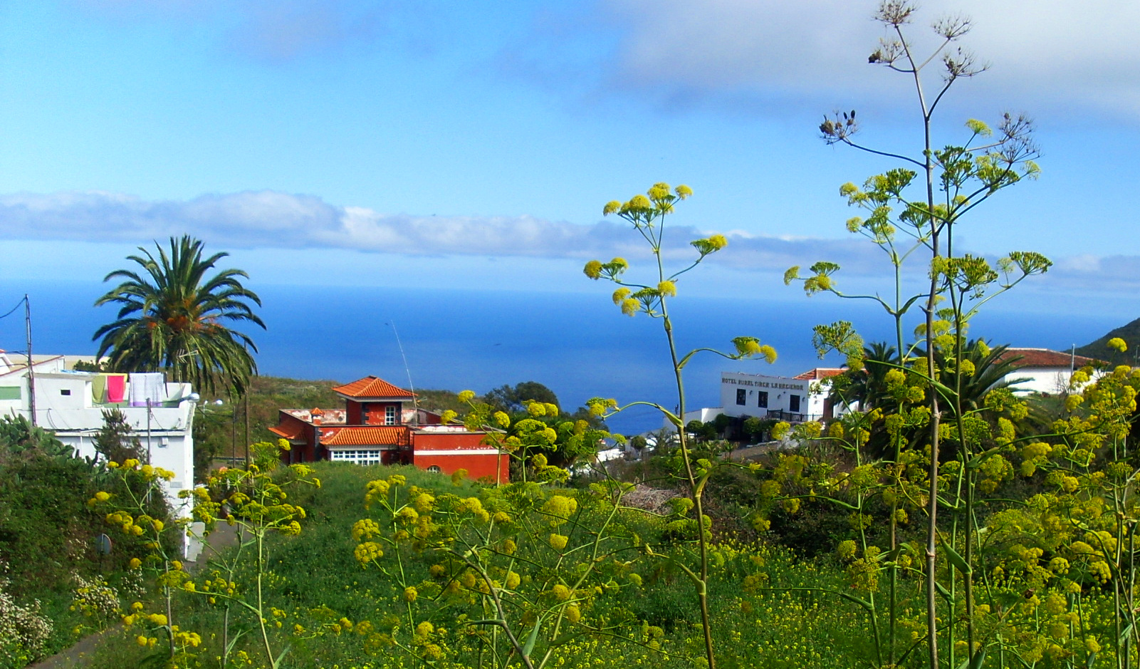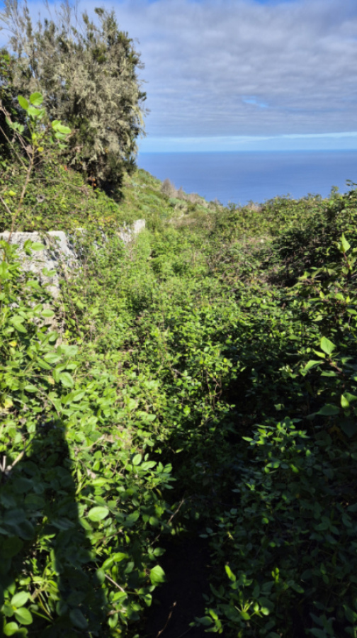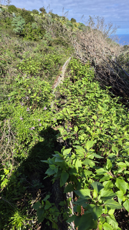 Zunächst geht man auf einem Asphaltsträßchen recht steil bergauf, aber nur knapp 400m. Bei einem Sackgassenschild knickt die Straße scharf rechts ab und verläuft nun eben. Nach 100m kommt eine Linkskurve, und nach weiteren 200m muss man aufpassen, denn hier verlässt man die Straße und den ausgeschilderten Wanderweg. Nach rechts zweigt ein Feldweg ab, der ins Tal hinunter geht. Nach einem kurzen Stück sieht man einen alten Brunnen und vielleicht schöne kanarische Glockenblumen im Gebüsch.