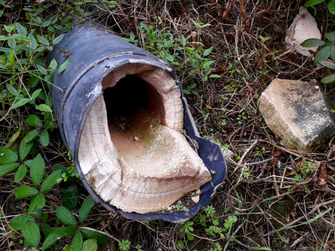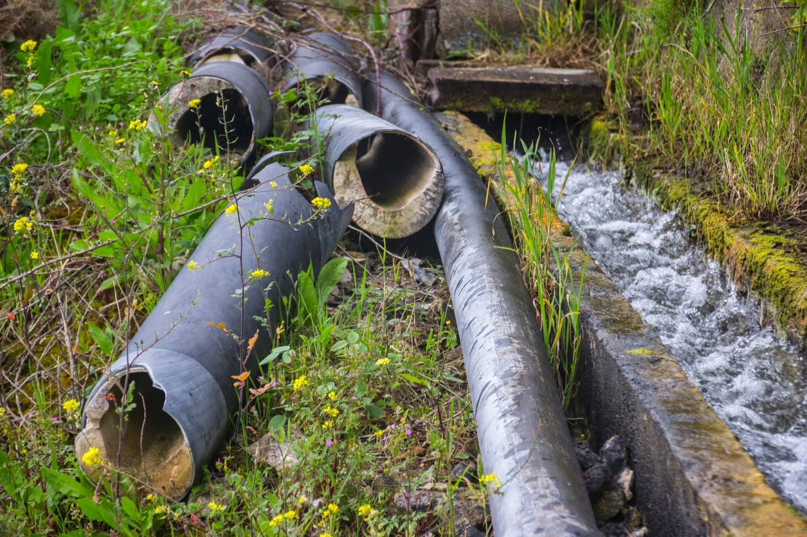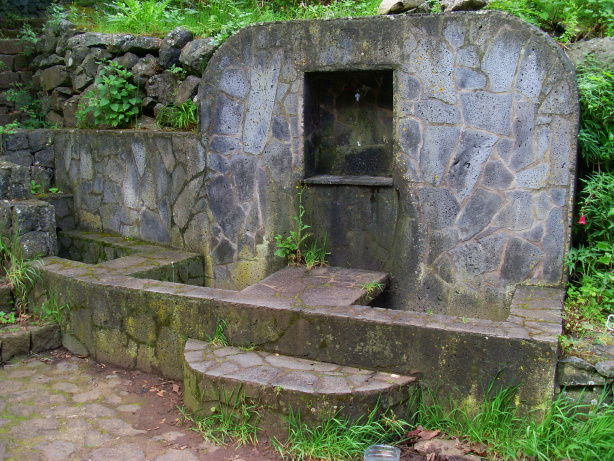 Der Kanal endet dann unvermittelt. An dieser Stelle rauschte das Wasser einst über einen Wasserfall steil den Berg hinunter. Grünes Moos wuchs auf den Felsen zwischen den Wasserrinnen, die sich über den ganzen Hang verteilten.