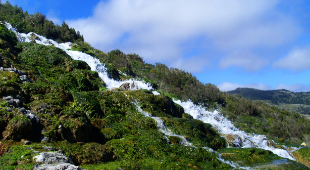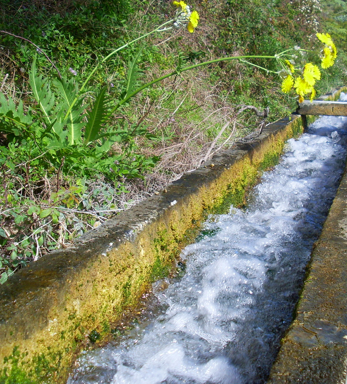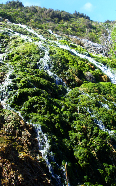 So nutzte man hier seit 2005 einen natürlichen Prozess: Das kalkarme Wasser stürzte unterhalb des Wasserfalls in eine steile Schlucht und weiter ins Tal, und konnte unten gesammelt und zur Bewässerung verwendet werden. Wie kalkhaltig das Wasser war, kann man an alten Rohren sehen, die innerhalb kurzer Zeit vom Kalk zugesetzt wurden. Auch im Kanal selbst musste regelmäßig die Kalkschicht abgeschlagen werden.