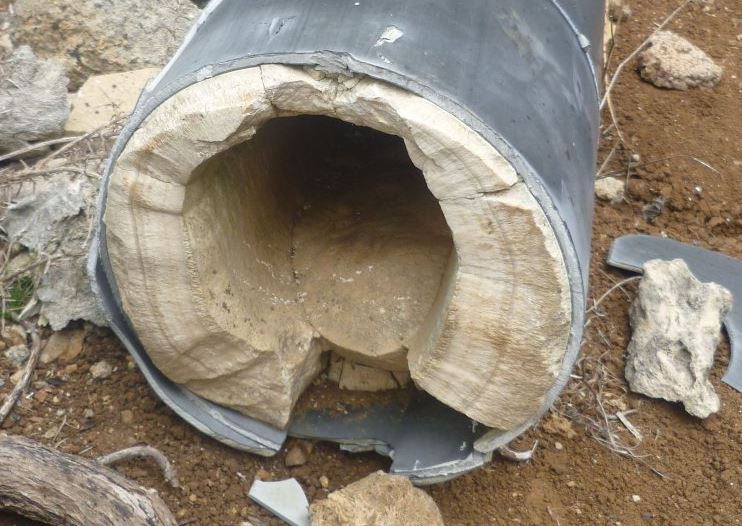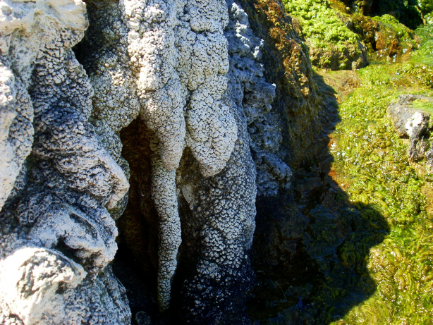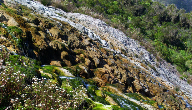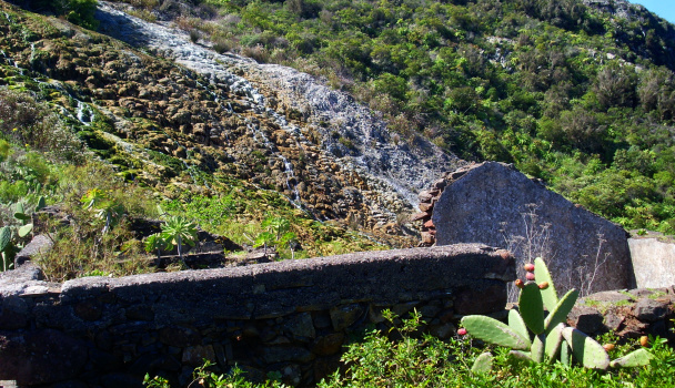 Hier fragt man sich natürlich, warum ein solcher Kanal gebaut wurde, wenn doch danach das Wasser unkontrolliert und ungenutzt den Hang hinunter rauschte. Doch es hatte einen guten Grund: Das Wasser stammt aus dem unterirdischen Tunnelsystem der Galería del Cubo, und dort wurde eine Wasserquelle angebohrt, die sehr stark kalkhaltiges Wasser zu Tage führt, vermutlich wegen kalkhaltigen Gesteinsschichten im Untergrund, was auf einer vulkanischen Insel extrem selten vorkommt. Dieses kalkhaltige Wasser konnte nicht zur Bewässerung genutzt werden, deshalb nutzte man hier einen chemischen Prozess, nämlich das Ausfällen des im Wasser gelösten Kalks.