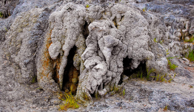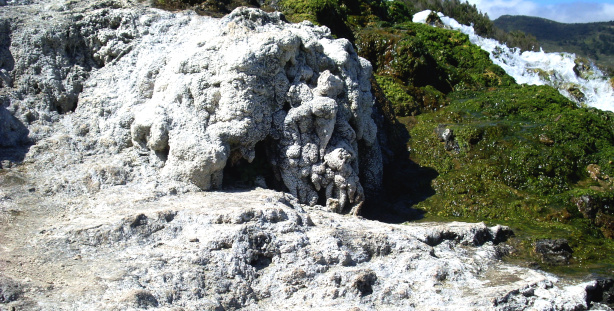 Begünstigt wurde die Kalkausfällung durch die vergrößerte Verdunstungsoberfläche auf den Felsen, die Erwärmung des Wassers und durch den Bewuchs. Moose, Algen und Cyanobakterien entziehen durch Photosynthese dem Wasser CO2, der pH-Wert steigt und die Löslichkeit des Kalks sinkt. Der Kalk fällt aus und legt sich als feine, kristalline Kruste über Steine, Felsen und Moose, die dadurch weiter in die Höhe wachsen. So entstehen fantastische, raffiniert geformte Gebilde, die man als Kalktuff bezeichnet und im Laufe der Jahre immer weiter wachsen.