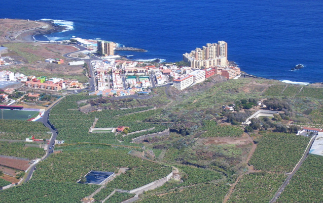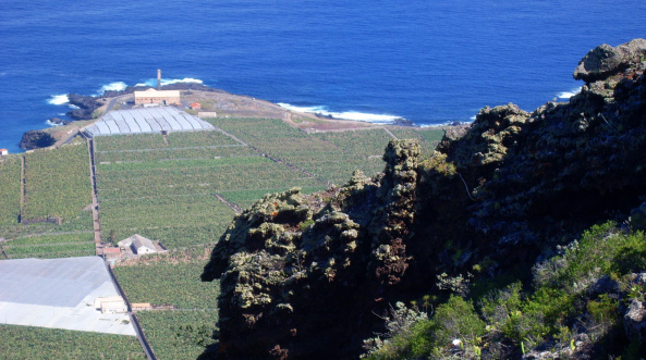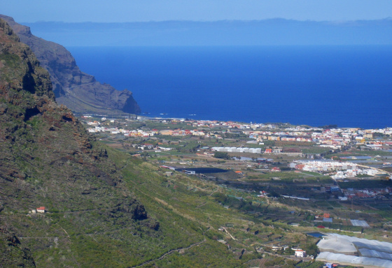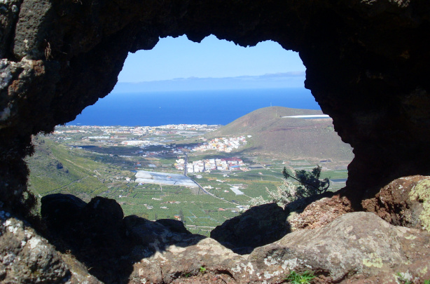 Hier sieht man Caleta de Interián und Los Silos aus der Vogelperspektive und die gesamte Isla Baja bis nach Buenavista del Norte. Unten an der Küste erkennt man den einzigen noch erhaltenen Schornstein einer alter Zuckerfabrik. Die unteren Teile der Abhänge gehören zum geschützten Naturreservat von Interián und beherbergen zahlreiche endemische Pflanzenarten.