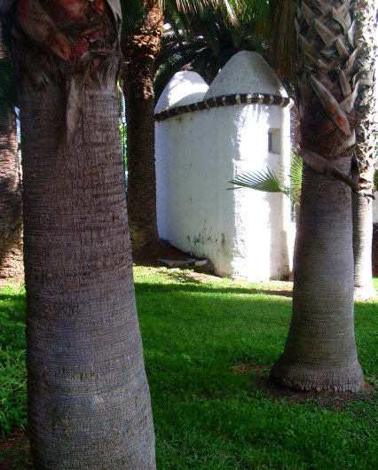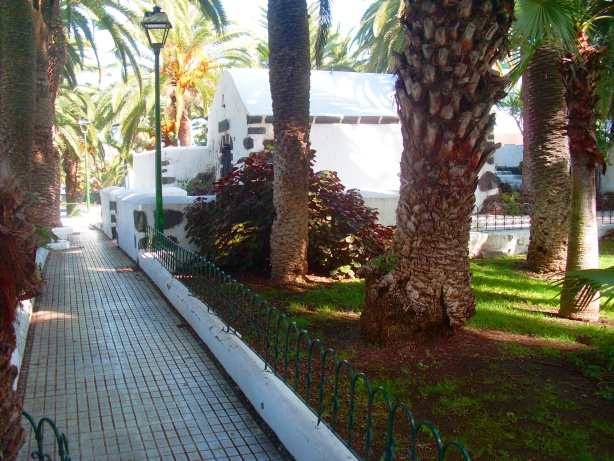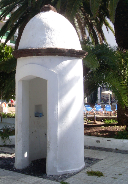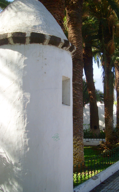 Auf der anderen Seite gibt es eine große, gekachelte Terrasse und noch zwei weitere kleine Schilderhäuschen. In dem kleinen angrenzenden Park stehen mächtige kanarische Dattelpalmen.