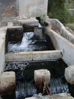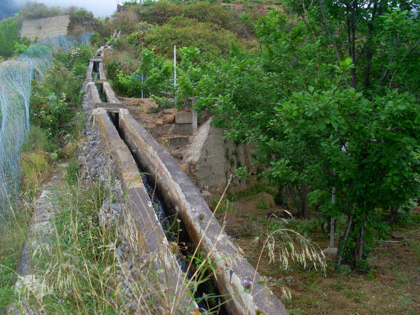 Der Hauptfluss des Wassers („gruesa“) wird aufgeteilt und abgemessen in ausgeklügelten „cantoneras“, wie man sie hier überall an den Kanälen sehen kann. Jedes Mitglied der Gemeinschaft erhält dann seine „dula“, die ihm zustehende Wassermenge, die nach einem festgelegten Zeitplan verteilt wird. Gemessen wird früher wie heute in der Einheit „pipa“, die 480 Liter entspricht.