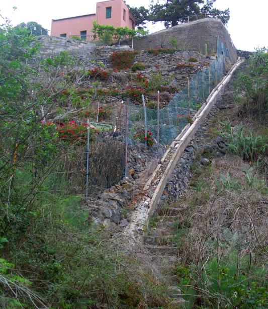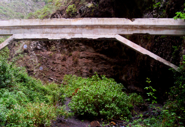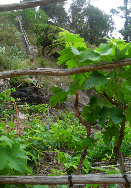 Diese Wanderung hier verläuft von der Hidro aus nun quer hinüber zum Barranco de Badajoz, und dies ist der unbequemste Teil der Wanderung, auch wenn es anfangs nicht so aussieht. Direkt unterhalb der Hidro führt eine steile Treppe neben einem Rohr hinunter ins Tälchen. Wenn man sich unten durchs Gebüsch geschlagen hat, geht man zunächst bequem auf oder neben einem Kanal weiter, der um einen Berghang herum führt. Man kommt zu einer zweiten, sehr steilen Treppe, und danach ist der Weg ist stark zerstört und zugewachsen. Man muss sich entweder entlang des Kanals weiter hangeln und durch Gebüsch hinunterklettern, oder einen Weg durch den Weinberg suchen. Aber es sind nur 20m. Das Ziel ist jedenfalls klar: Unten sieht man schon den Schotterweg im Barranco de Badajoz.