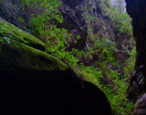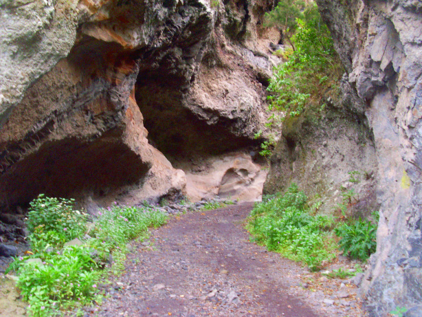 Viele Wanderer kehren bei der Galería Izaña um, weil sie denken, dass es nicht weiter geht. Aber mit etwas Kraxelei kommt man noch etwas weiter. Nachdem man über nasse Felsblöcke, verrostete Schienen und die Abraumhalde geklettert ist, führt ein schmaler Pfad zwischen Brombeerbüschen noch etwa 20m in den jetzt nur noch einen Meter breiten Bachlauf hinein. Man steht staunend zwischen senkrechten Felswänden und kann sich kaum vorstellen, dass diese viele hundert Meter hoch sind. Unmittelbar vor einer solchen Felswand endet dann auch der begehbare Teil der Schlucht.