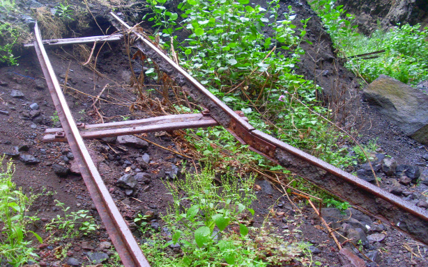 Allerdings sieht es zunächst gar nicht so dramatisch aus. Das Schottersträßchen steigt auf etwa 900m Länge gemächlich an, man beobachtet aber schon, wie das Tal langsam enger wird. Doch dann geht man geradewegs auf einen schluchtartigen Einschnitt zu. Links oben befindet sich der Ausgang einer Galería, wo noch alte Schienen aus dem Tunnel herauskommen. Nach einem kurzen, steilen Abschnitt, der mit großen Steinen gepflastert ist, befindet man sich nun plötzlich zwischen steilen Felswänden, die vom Wasser ausgewaschen sind.