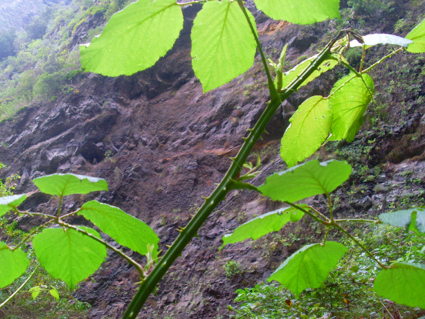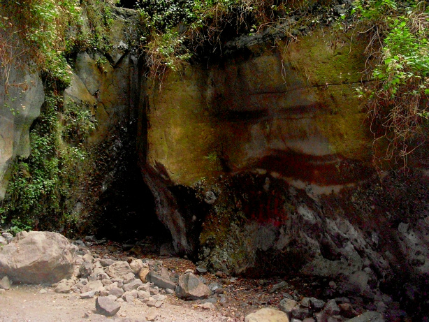 Rechts oben am Hang kann man zu einem weiteren Ausgang einer Galería aufsteigen, aber viel zu sehen gibt es dort nicht. Die Vegetation hat sich stark verändert. Hier wachsen keine Tabaibas oder Kakteen mehr. In der schattigen und feuchten Schlucht findet man Brombeeren, Brennnesseln, Zistrosen und zwei Meter hohe Margaritenbüsche.