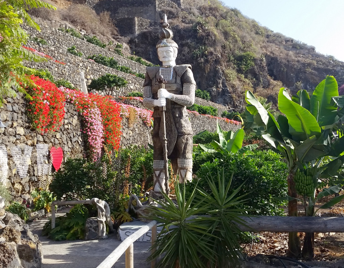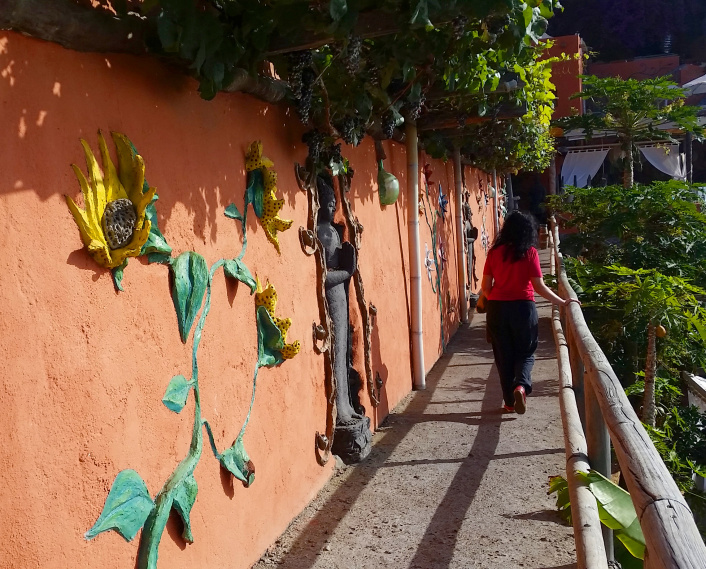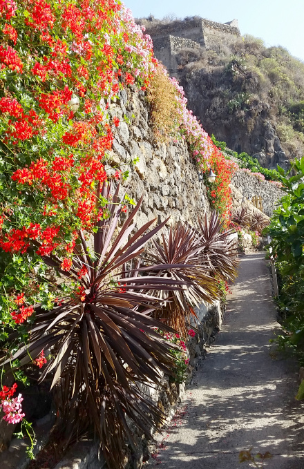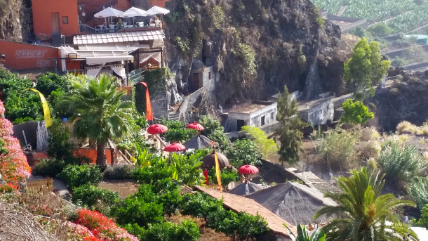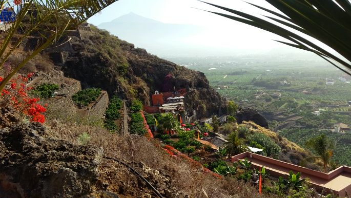 Oben die Mauer der Autobahn, wo 50m höher der Verkehr entlang donnert, unten tiefe Abgründe mit Ackerterrassen und Obstbäumen, rechts und links unüberwindbare Felsen. Genau dazwischen liegt das schönste Aussichtslokal Teneriffas. Der Blick schweift weit über das Orotavatal, direkt unterhalb die Bananenplantagen von El Rincón, weiter weg Puerto de la Cruz, und über allem thront der Teide. Diese Aussicht gibt es natürlich an mehreren Stellen hier in der Gegend. Aber dieser Ort ist so exklusiv und eigenartig, dass man nach jedem Besuch unbedingt bald wiederkommen möchte.