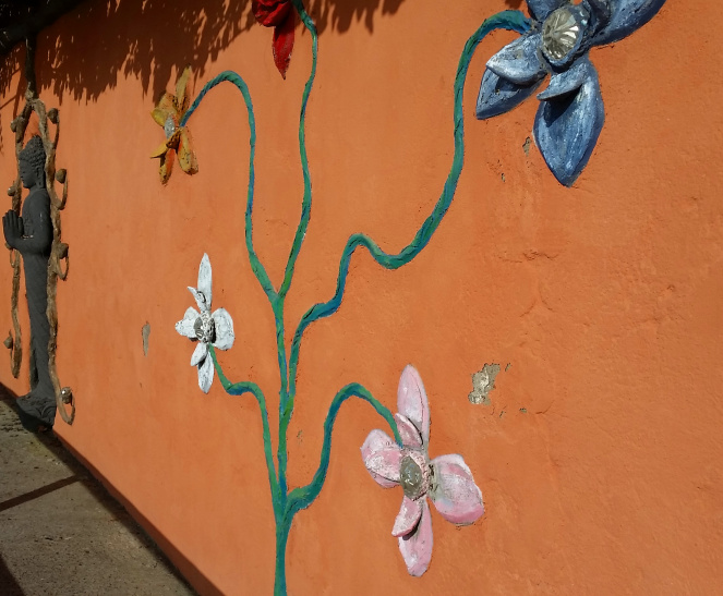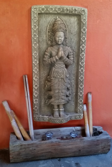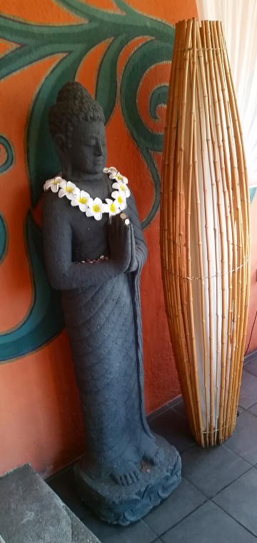 Schon am Eingang zum Lokal grüßt ein mehrere Meter hoher thailändischer Tempelwächter, und viele kleinere Buddha-Statuen verteilen sich über das Gelände. Die Wände sind farbenfroh bemalt, Pflanzen und Kunstwerke und liebevolle Kleinigkeiten ergänzen das fantastische Gesamtbild.