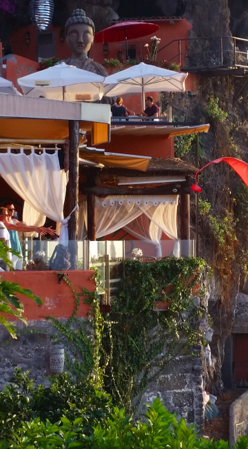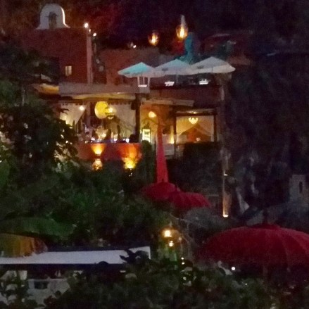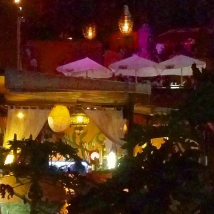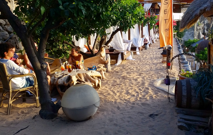 Auf der Strandterrasse stehen Himmelbetten im Sand, die Kellner servieren die Drinks ans Bett, und man kann dem Sonnenuntergang entgegenkuscheln. In verschiedenen Bereichen sitzt man an der Bar, versinkt zwischen Sofakissen oder gruppiert sich um Holztische aus alten Wurzeln. Oder man speist in einem Fischerboot, dessen Bug über den Abgrund hinausragt. Bunte Blumen aller Art, Papaya- und Mangobäume, sich drehende Wasserkugeln, fernöstliche Sonnenschirme, Glockenspiele und blinkende Lämpchen am Abend. Das Auge kann sich gar nicht satt sehen an den vielen Details.