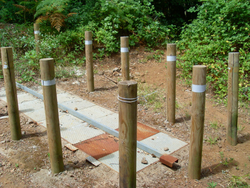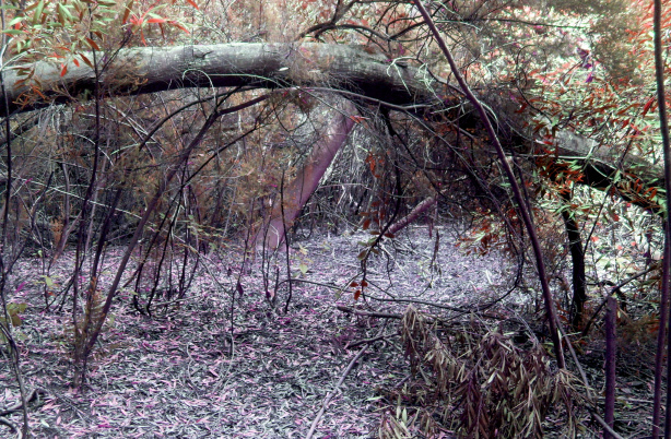 Am Wasserdepot geht man links abwärts und darf die 12 Holzpfosten nicht verpassen zwischen denen ein Zugang zu einer Wasserleitung liegt. Direkt hinter den Holzpfosten schlägt man sich links ins Gebüsch und kommt gleich danach wieder auf einen Fahrweg. Etwa 10m hinter der Absperrkette schlägt man sich rechts ins Gebüsch. Ein schmaler Pfad führt abwärts durch einen gespenstischen Märchenwald, und man muss gelegentlich über umgestürzte Bäume klettern.