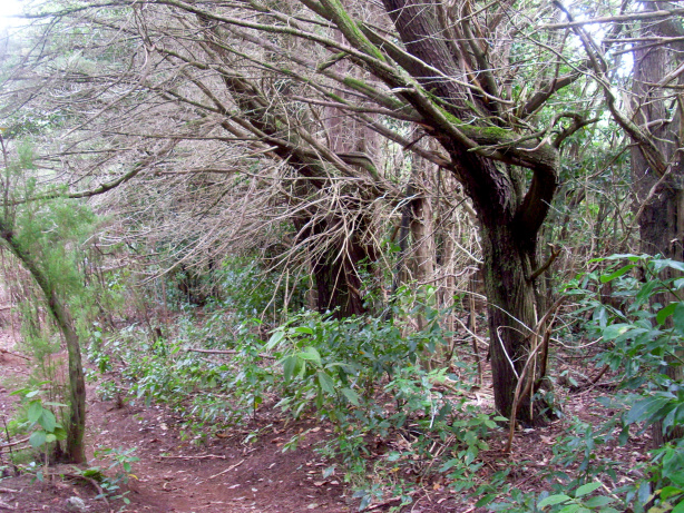Nach wenigen Minuten kommt man zu einer ebenen Waldlichtung, wo ein Rastplatz für Behinderte angelegt wurde. Hier stehen ein paar schöne Erdbeerbäume. Die Früchte sind essbar, schmecken aber fad. Der Rastplatz hat einen Rollstuhl gerechten, betonierten Zugangsweg, dem man aber nicht folgt, sondern rechts hinten auf dem gelb/weiß markierten Wanderweg weiter aufsteigt. Er führt im Zickzack durch den Lorbeerwald, steigt später etwas steiler auf und kreuzt einen etwas breiteren Waldweg. Der markierte Wanderweg führt weiter oben dann am Waldrand entlang und zweigt links ab zum Picknickplatz Lomo de la Jara.