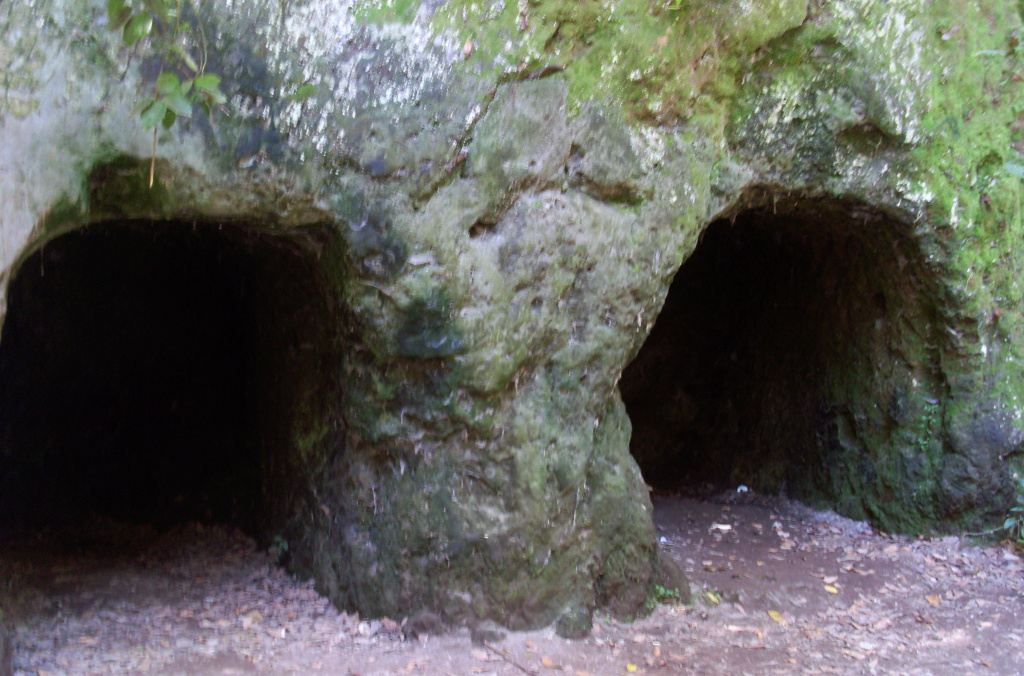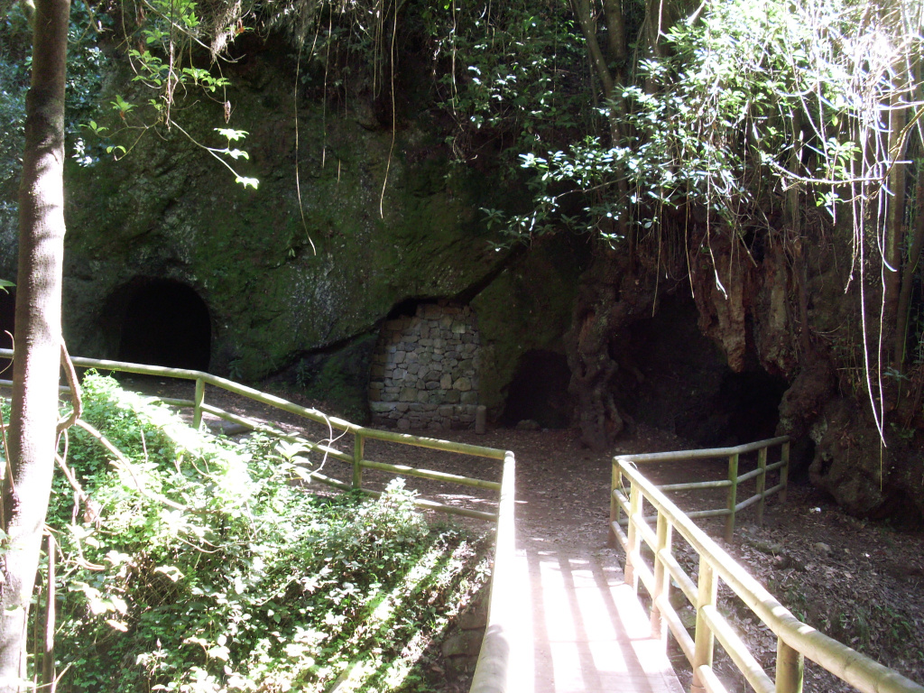Hinter dem Klo-Häuschen geht der Wanderweg weiter in ein Tal, biegt aber sofort wieder scharf links ab. Nach einem kurzen Aufstieg senkt sich der Weg, kreuzt die Fahrstraße und knickt danach wieder scharf links ab. In wenigen Minuten steigt man hinunter zu den Cuevas de Toledo, wo im 16. Jh. das Gestein Trachyt abgebaut wurde. Dies ist die einzige Stelle auf den Kanaren, wo diese Art von Vulkangestein vorkommt. Es ist reich an Alkalifeldspat, der zur Herstellung von Glas benötigt wird, und war damit ein wichtiger Rohstoff für die Glasfabrik in Tacoronte. Diese fertigte die dringend benötigten Weinflaschen. Damit hatten diese Höhlen eine große Bedeutung für die wirtschaftliche Entwicklung der Insel. Es gab im Wald auch einen Schmelzofen. Der Abbau wurde aber wieder eingestellt, weil die Ausbeute zu gering war.