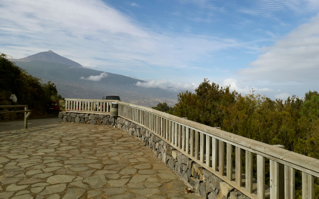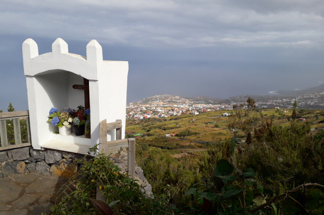 Man beginnt die Wanderung am Cruz de la Atalaya. Das ist eine kleine Aussichtsterrasse mit einem Heiligenschrein. Von dort aus sieht man schön hinunter nach Santa Ursula. Im Westen grüßt der Teide.