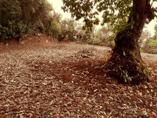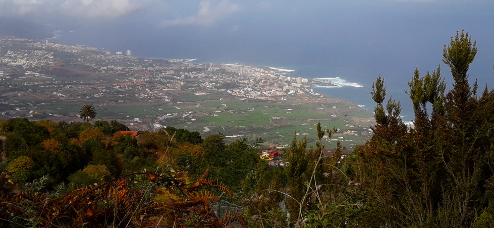 Hier ist wieder eine kritische Stelle. Genau in der Rechtskurve beginnt versteckt auf der linken Seite, gleich neben dem Schild „Reserva Natural Integral Pinolere“, ein schmaler Pfad, der sofort sehr steil abwärts führt. Es ist aber nur ein kurzes Stück, danach wird er wieder bequemer. Nach 300m kommt man zum Waldrand. Hier lohnt es sich unbedingt, einen kleinen Abstecher über die Felder zu machen. Diese terrassierten Kartoffelfelder enden abrupt am Steilabbruch. Von dort hat man einen herrlichen Ausblick. Tief unten liegt La Orotava, an der Küste sieht man Puerto de la Cruz, und bei wolkenfreiem Himmel natürlich auch den Teide.