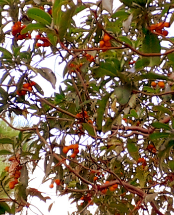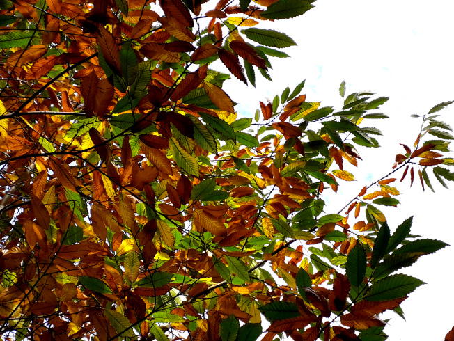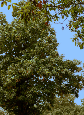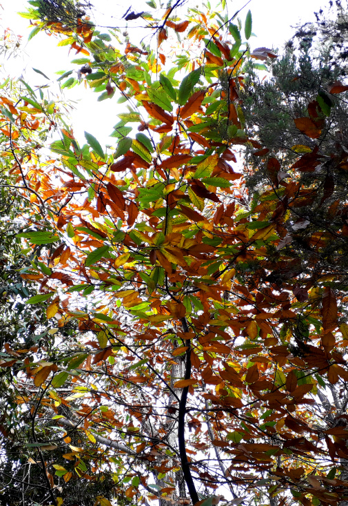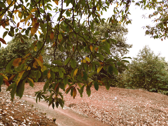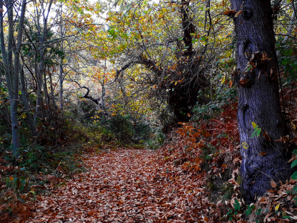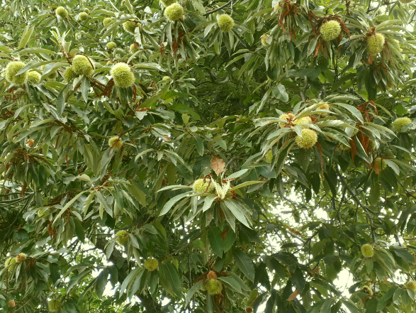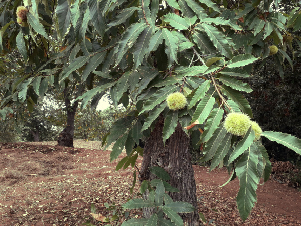 Und hier stehen auch eine Vielzahl von majestätischen Kastanienbäumen. Der Boden ist übersät mit Kastanien. Dazwischen mischen sich Erdbeerbäume mit ihren leuchtend orange-gelben Früchten. Sie sind essbar, haben aber wenig Geschmack.